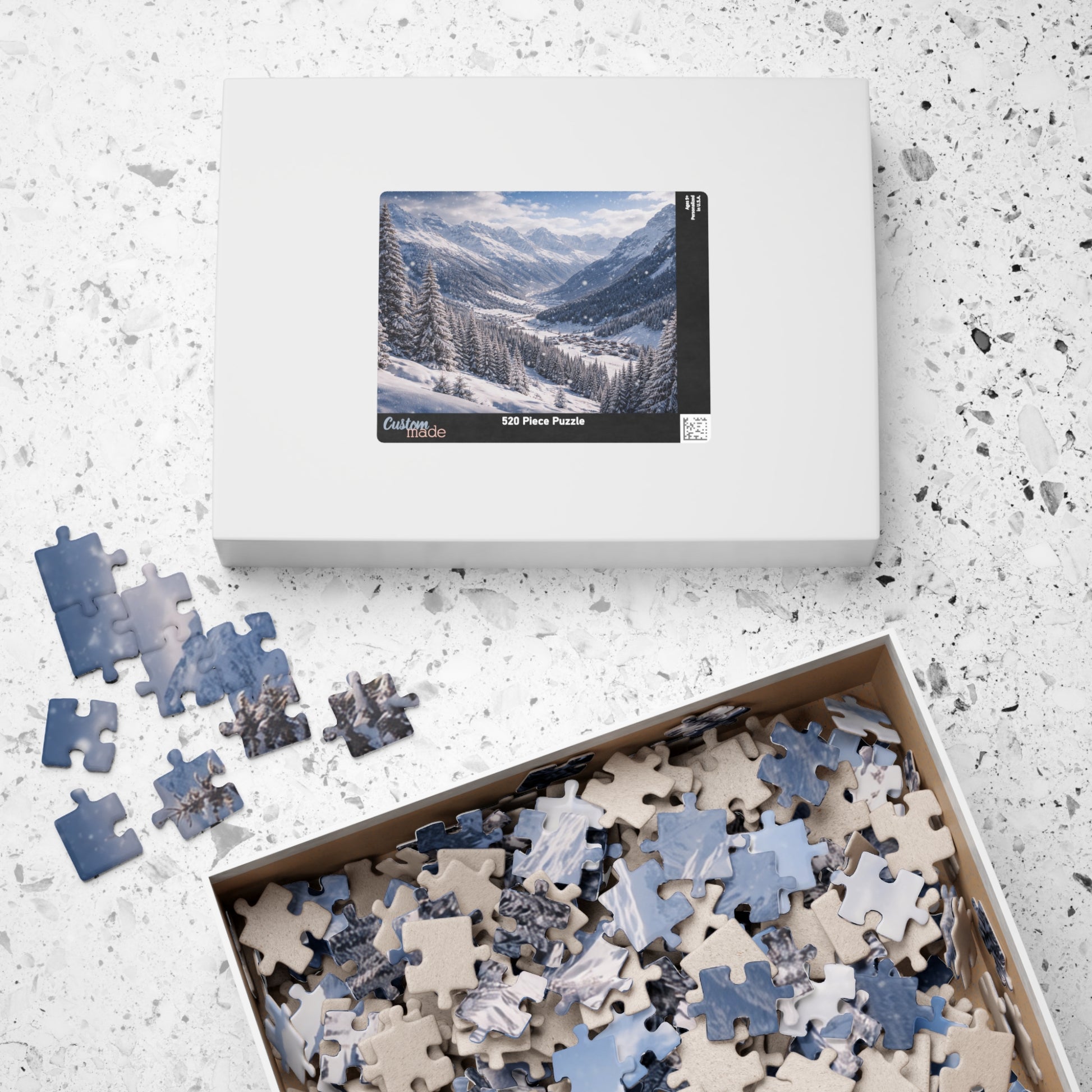 A crisp alpine valley, layered peaks, and snowfall drifting through clear winter light—this panoramic puzzle turns your table into a peaceful mountain escape. As you connect each piece, the scene opens from snow-laden evergreens in the foreground to a distant village tucked deep in the valley, with bright ridgelines stretching across the horizon. The high-definition print and glossy laminated finish make the icy blues and soft whites feel luminous, while sturdy 100% chipboard pieces lock together cleanly for a smooth, satisfying build. Choose your preferred challenge level (110–1014 pieces) for anything from a quick, calming break to a longer, immersive weekend project. Perfect for cozy nights in, gift-giving for nature lovers, or anyone who enjoys scenic puzzles with sweeping depth and detail.