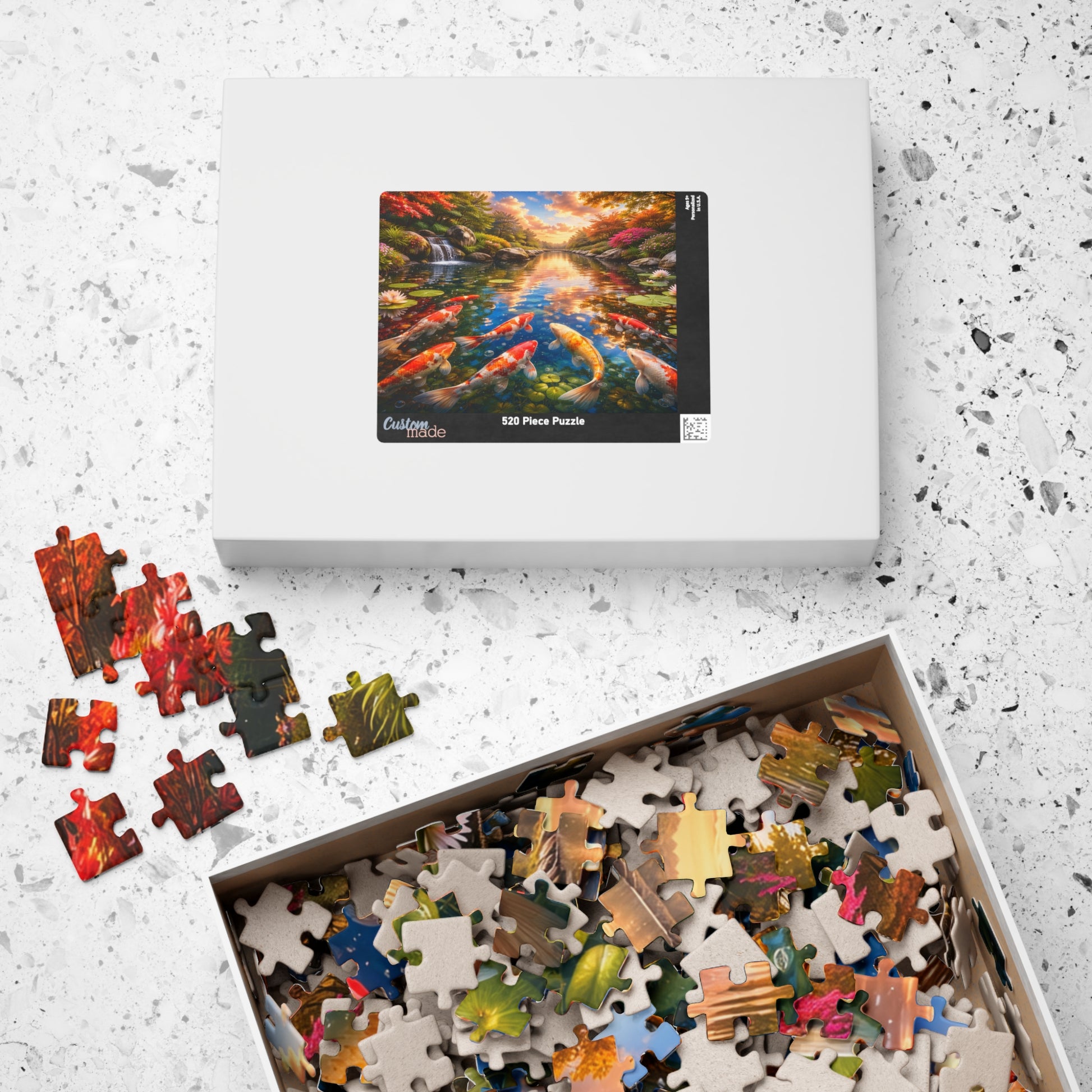 Sunset turns this koi pond into a living mirror—brilliant sky colors ripple across the water while vivid koi glide beneath lily pads and glowing autumn leaves. This puzzle is designed to be satisfying from the first sort to the final click: each section reveals new details—sparkling reflections, smooth stones under the surface, and the soft spray of a small waterfall tucked into the garden. The high-gloss print makes the colors pop (fiery reds, deep blues, warm golds), and the sturdy chipboard pieces fit snugly for a clean, satisfying build.