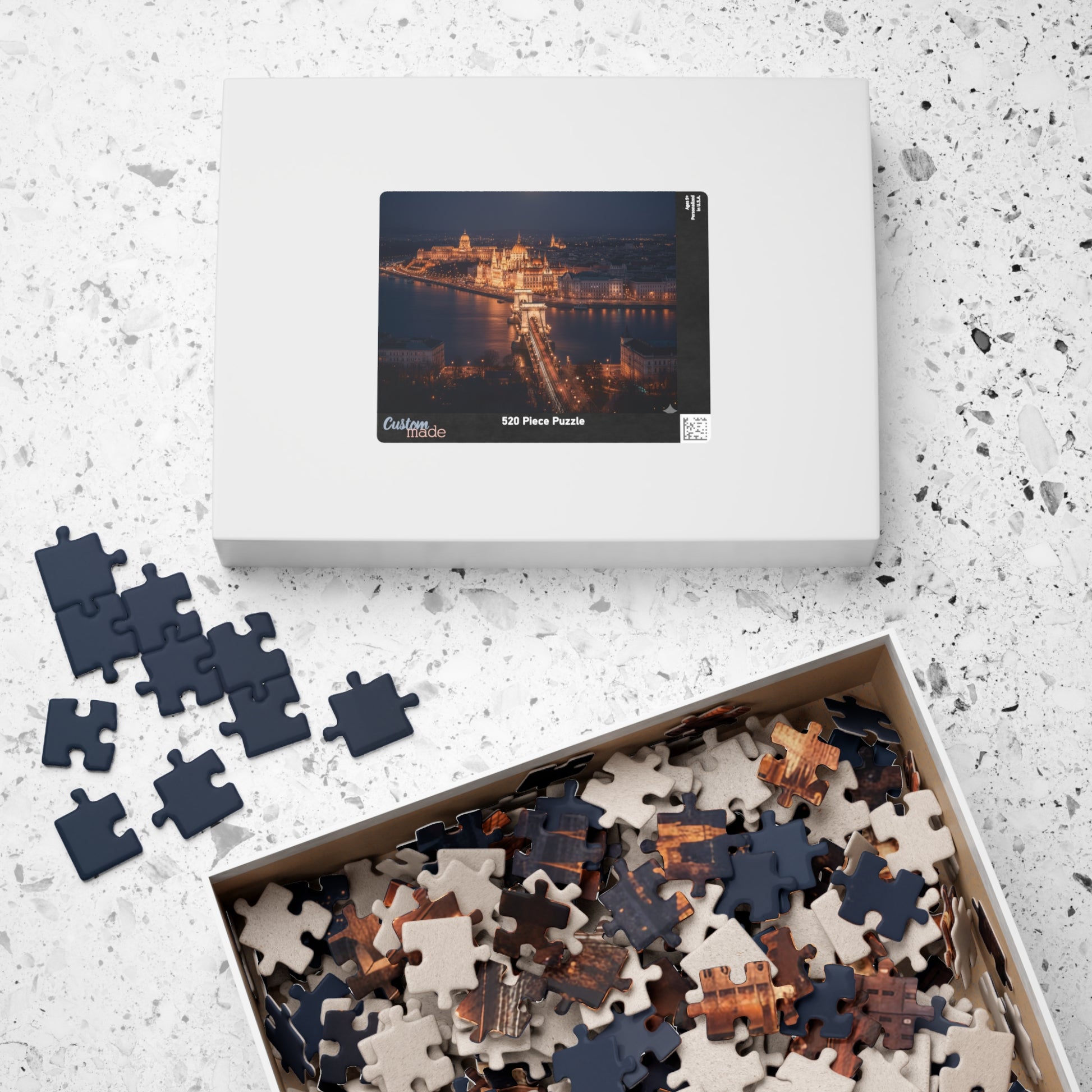 Spread out on the table like a quiet ritual, this glossy photo puzzle invites slow evenings and shared focus. The rich, luminous print captures a cityscape at night — warm lights spilling across water, the sweep of a bridge, and blurred halos that feel like memory more than a snapshot. Each snug chipboard piece snaps into place with a satisfying fit, and the laminated sheen preserves those jewel-like tones as you work. It’s for people who collect moments: travelers who trace routes they’ve walked, night owls who love the hush of late hours, and friends who want a calm project to return to. Boxed in a printed paper case, it travels easily as a keepsake or a thoughtful activity to open together on holidays and quiet house visits.