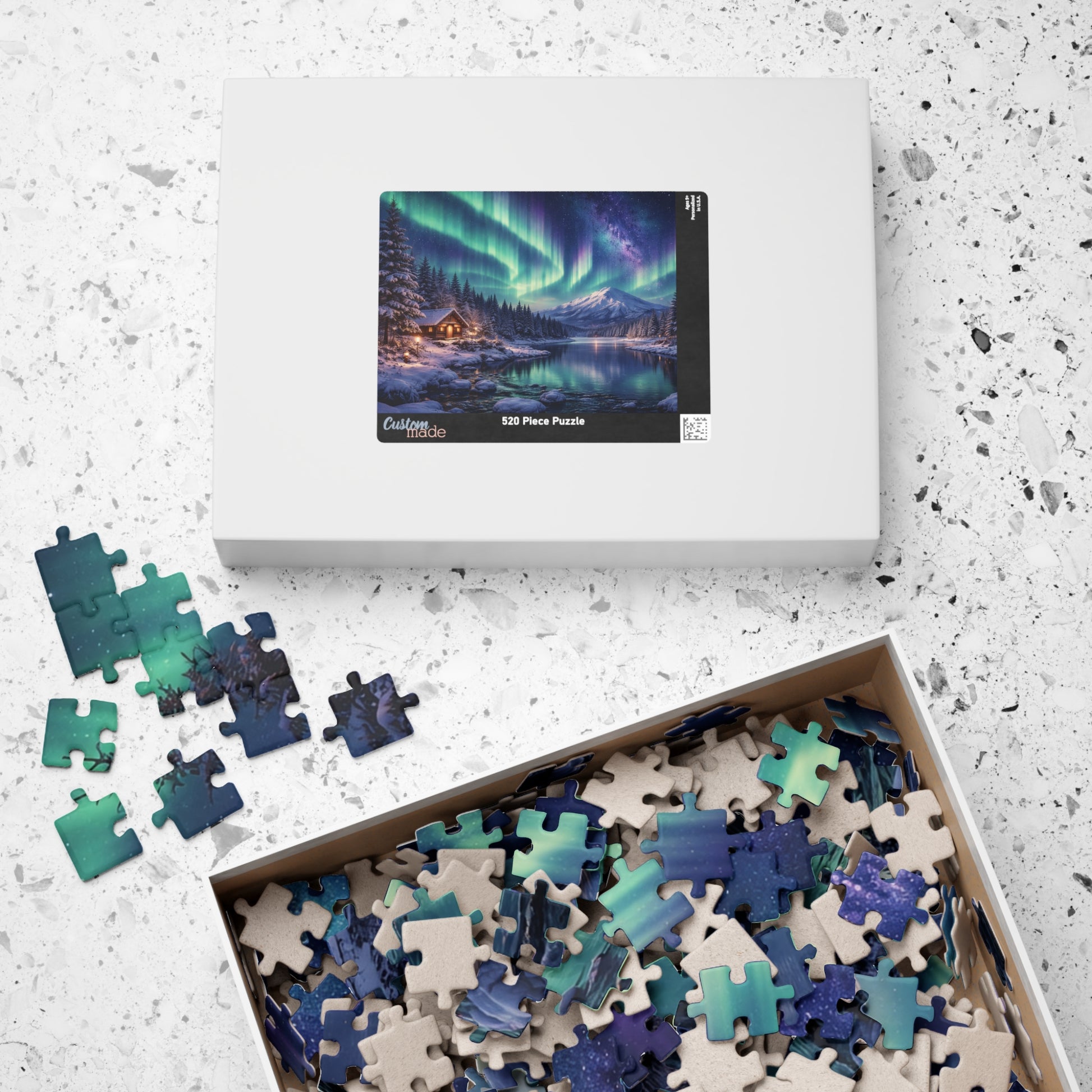 Pull up a chair by the lake and lose an evening to this northern-winter scene. The puzzle’s glossy print captures dancing auroras, a snow-dusted cabin, and the mirrored stillness of icy water — each piece revealing more of the hush and warmth of a cold night. As you fit pieces together, the forest edge and distant peak come into focus, turning quiet concentration into a small, shared ritual. This is for people who savor slow projects, cozy nights, and the particular calm of snowy landscapes. Leave the lights low, set a warm drink nearby, and let the image bring that cabin’s glow right into your living room.