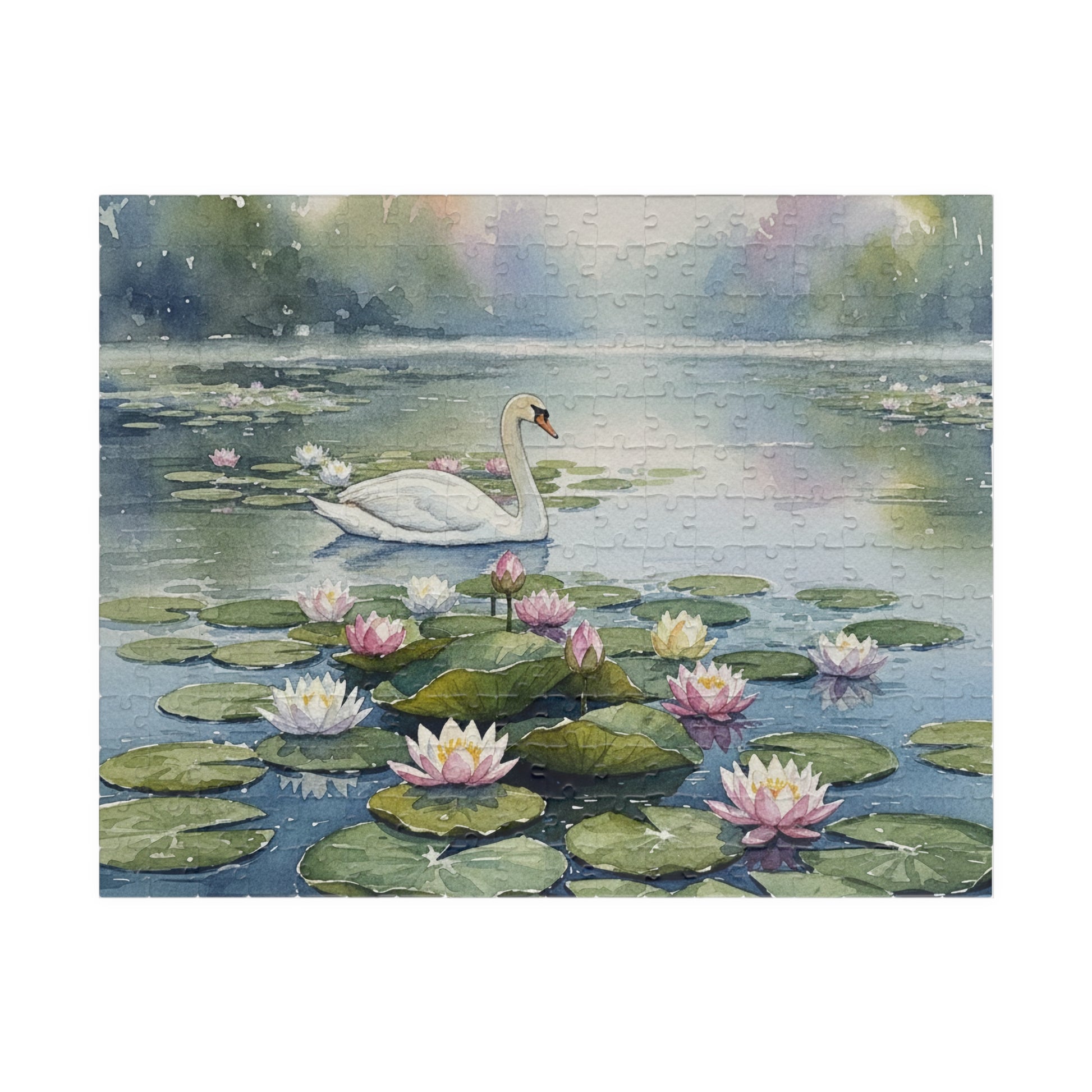 Swan on Lily Pond Puzzle | 520 Piece Jigsaw, Watercolor Swan Scene